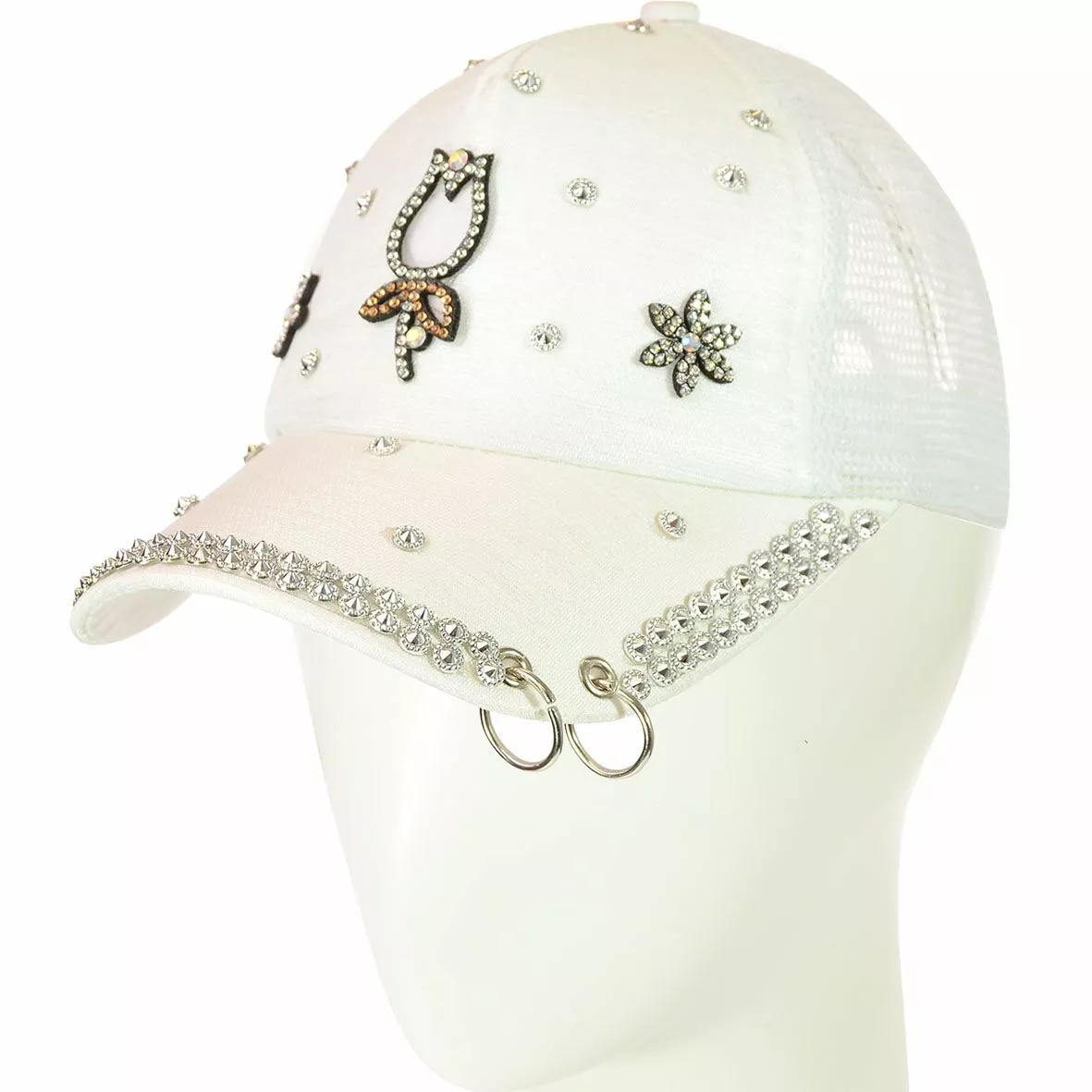 козырьке украшен двумя кольцами и стразами. Задняя часть