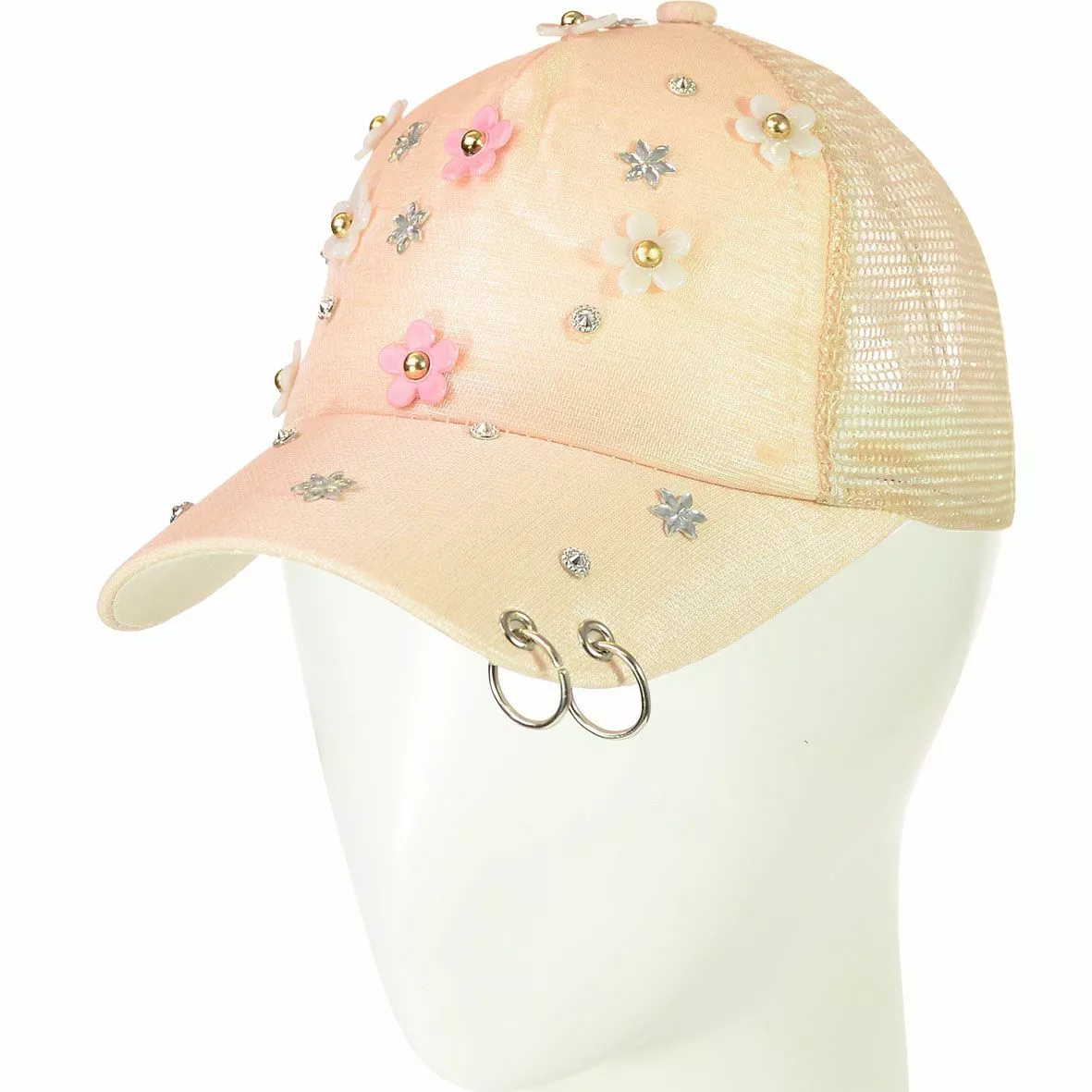 Яркая бейсболка, декорирована цветами на передней части изделия, а
