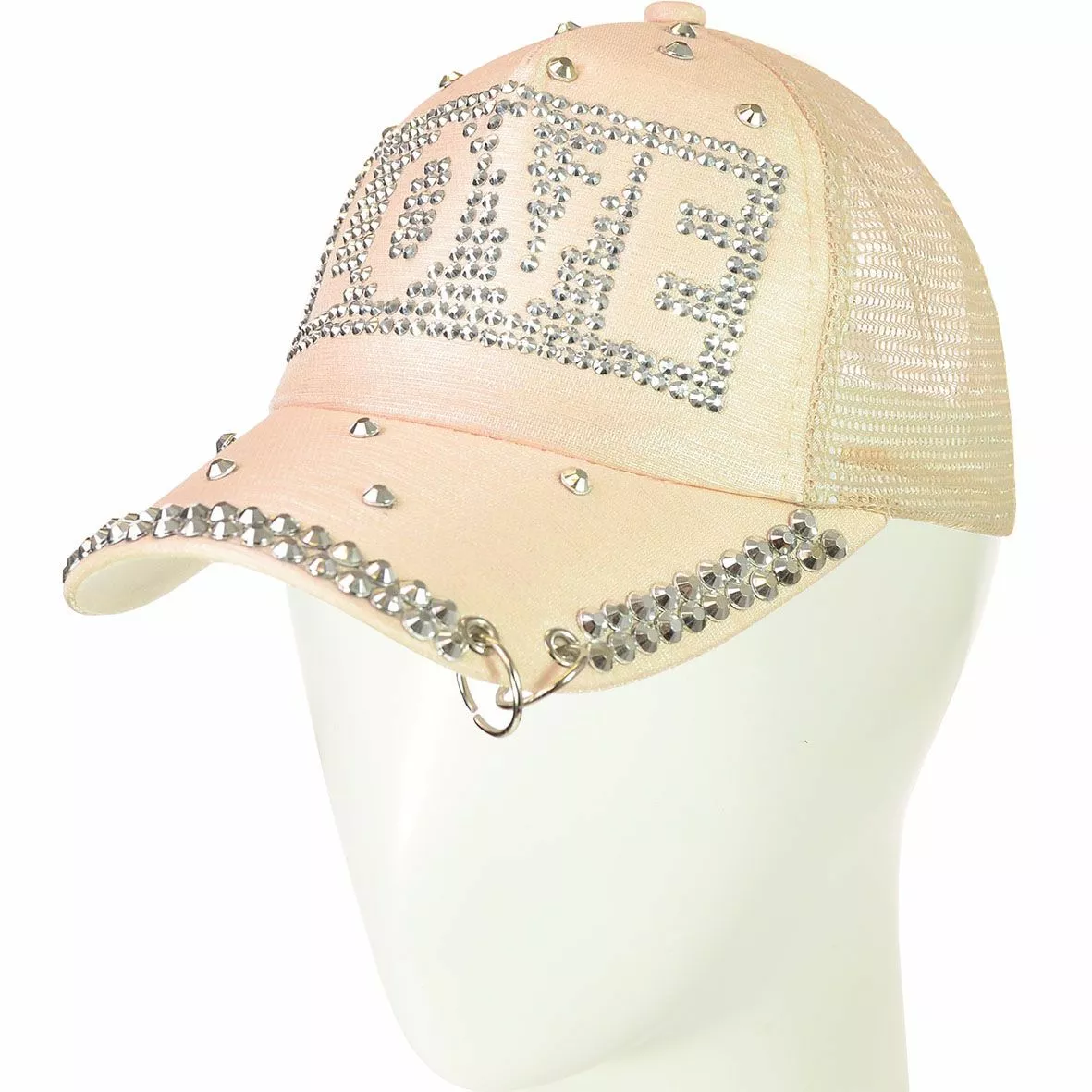 передней части изделия, а на козырьке - двумя кольцами и стразами -