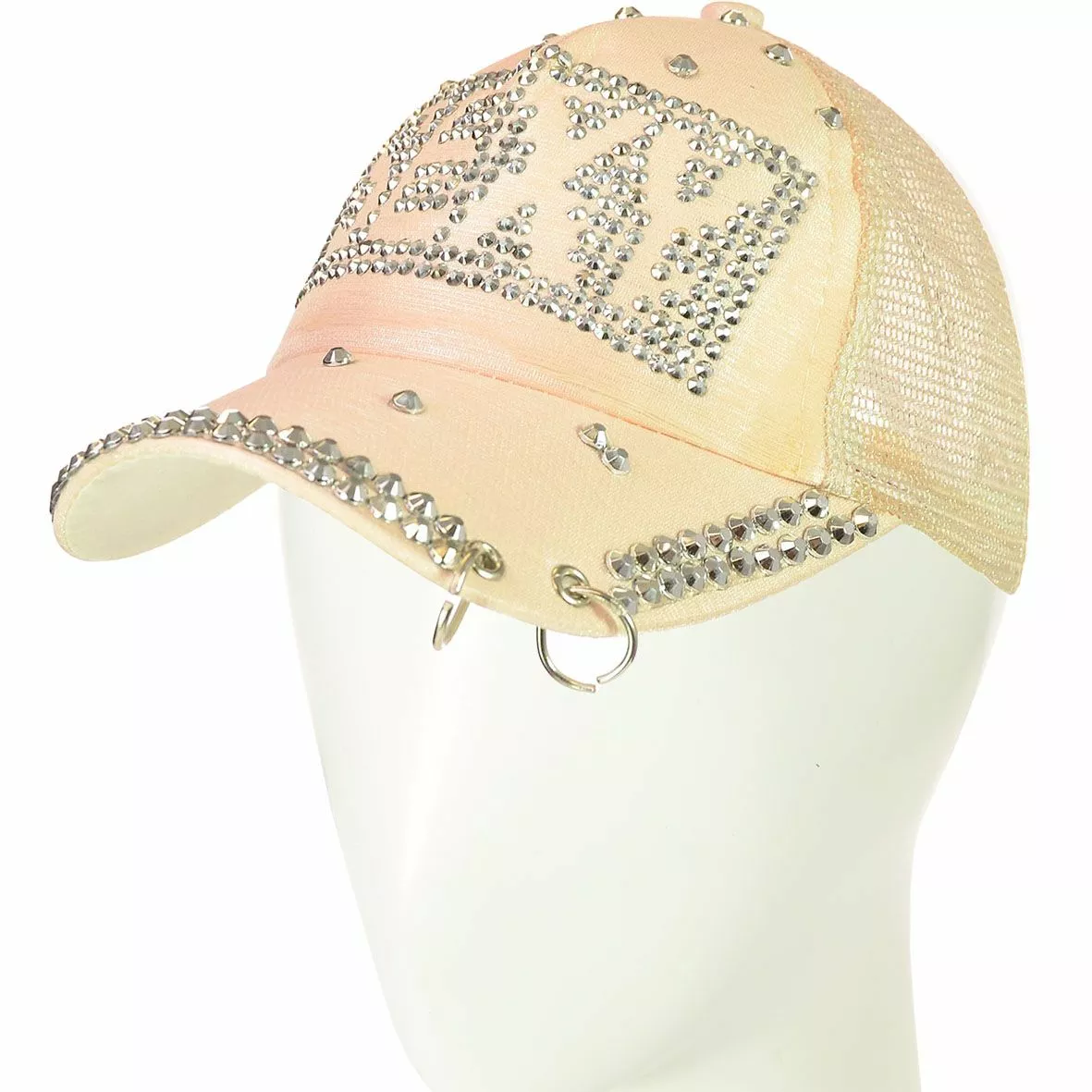 передней части изделия, а на козырьке - двумя кольцами и стразами -