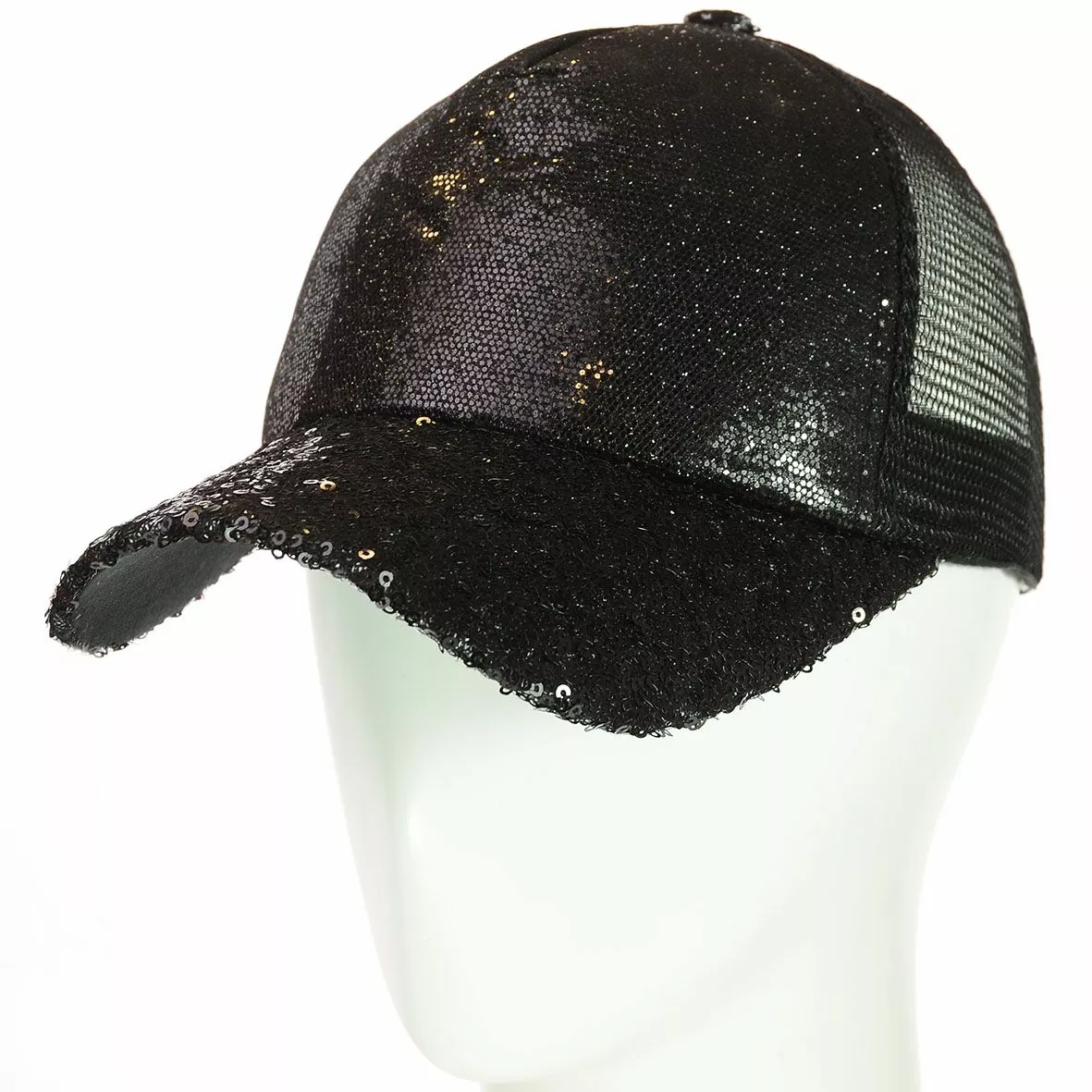 Яркая бейсболка, декорирована пайетками, на передней части изделия
