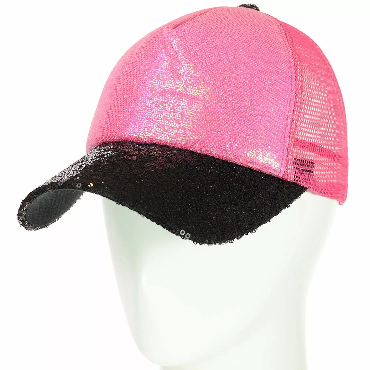 Яркая бейсболка, декорирована пайетками, на передней части изделия