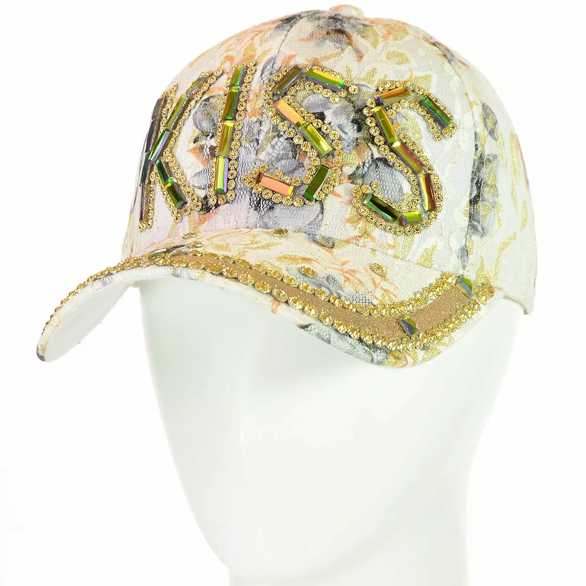 Кепка декорирована надписью с камней и страз "KISS", все это