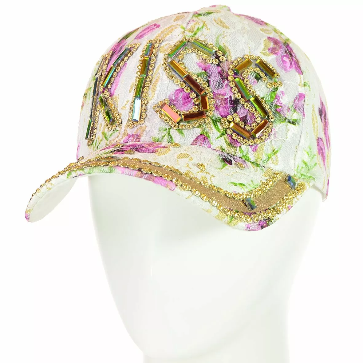 Кепка декорирована надписью с камней и страз "KISS", все это