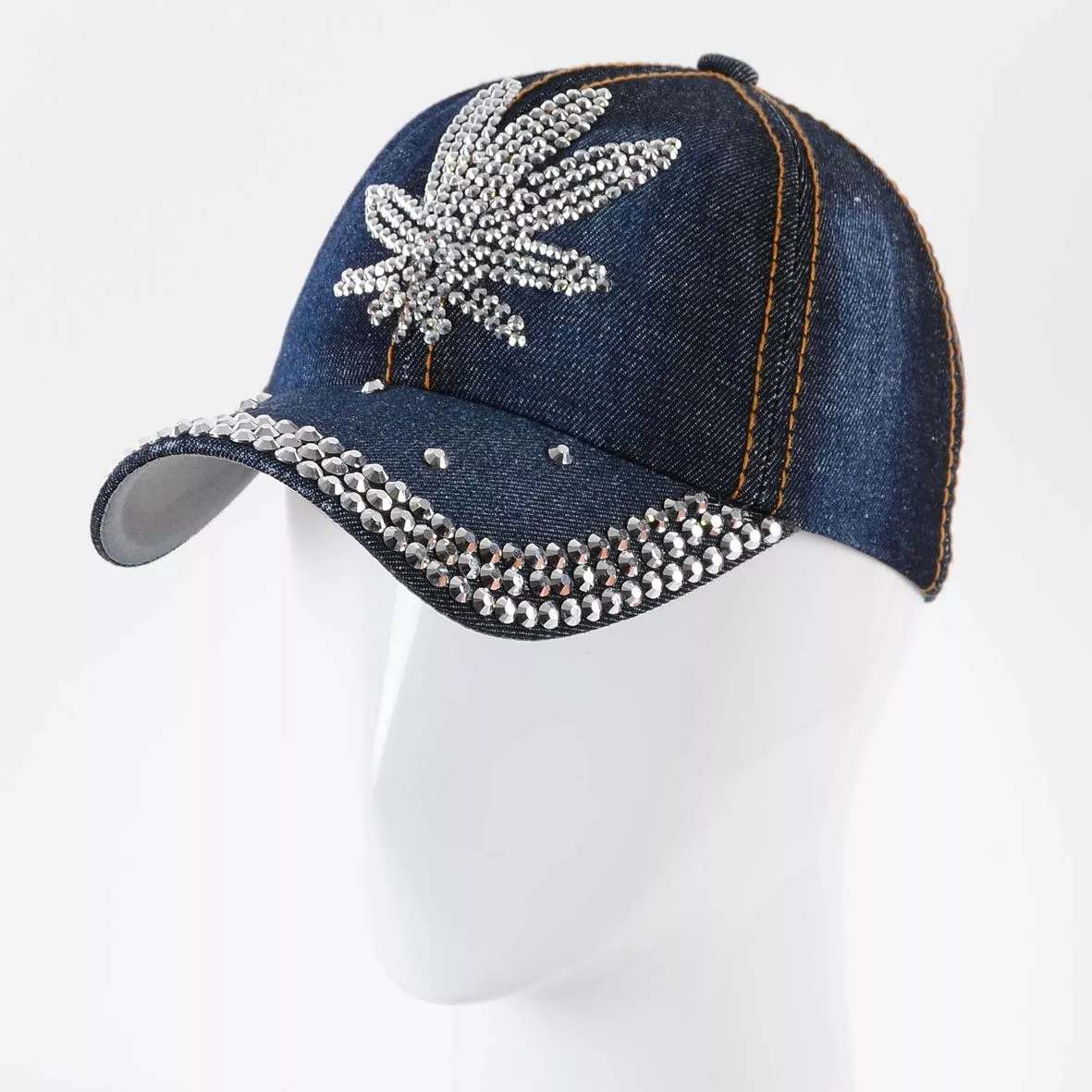 Джинсовая кепка с крупными стразами на козырьке и мелкими стразами