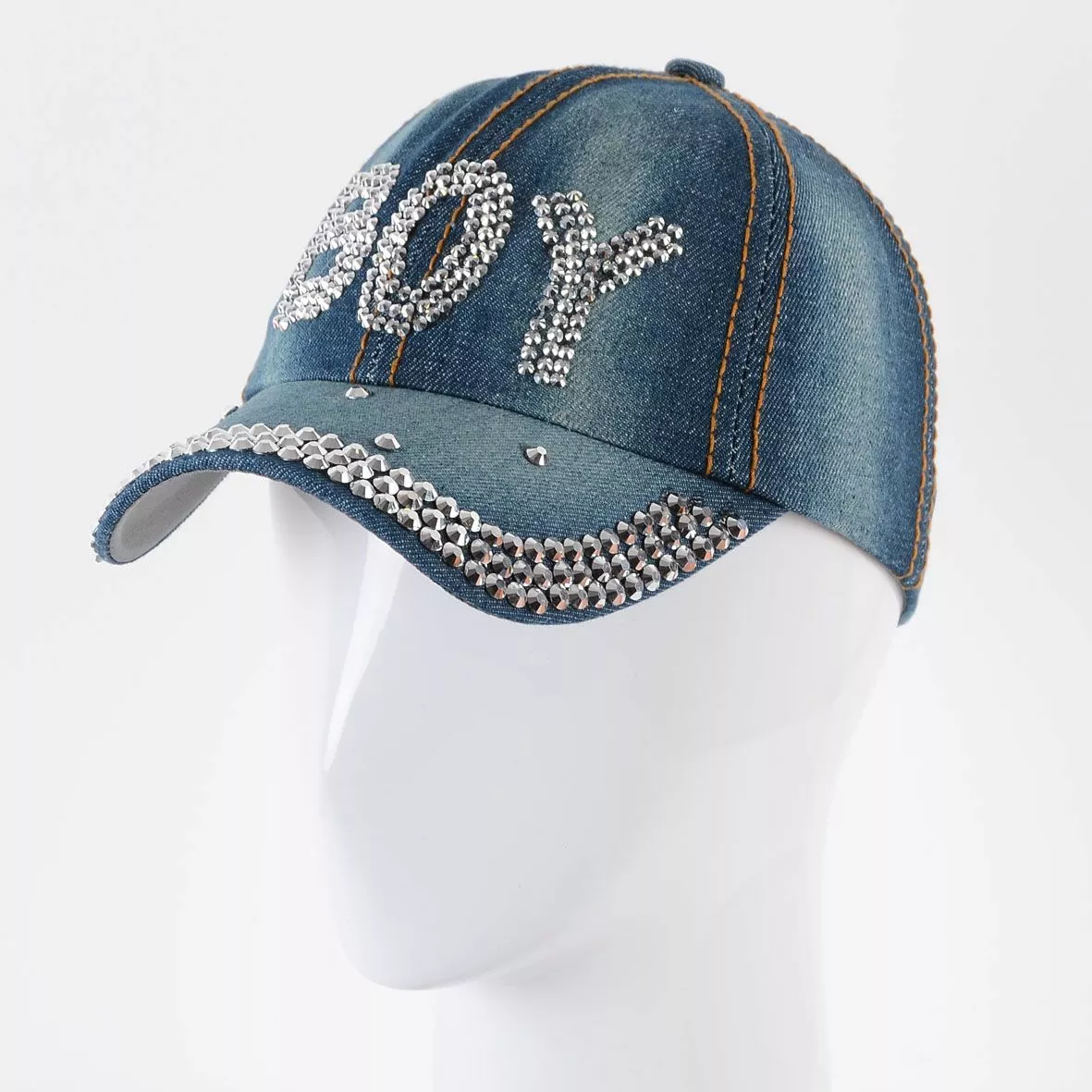 Джинсовая кепка с крупными стразами на козырьке и мелкими стразами