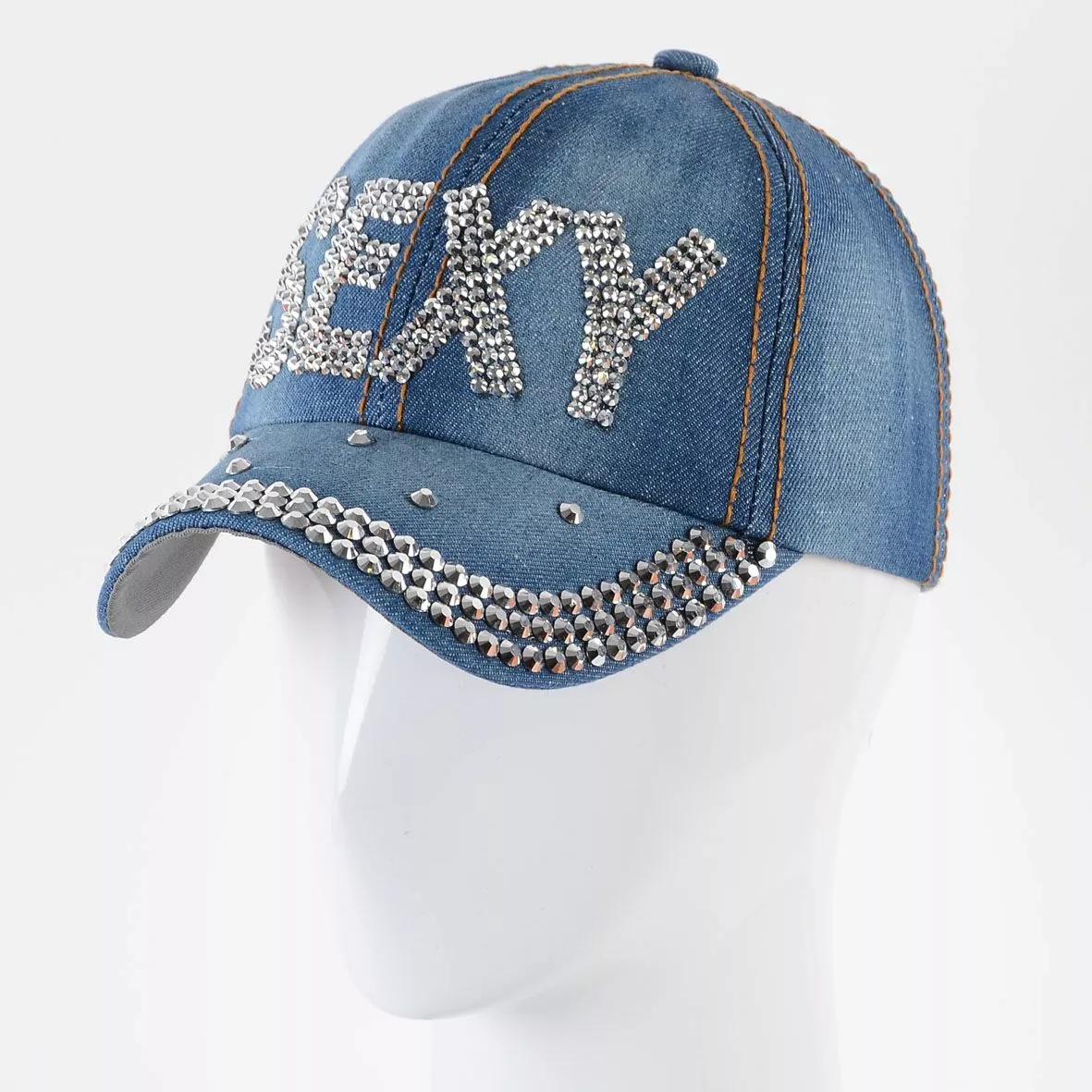 Джинсовая кепка с крупными стразами на козырьке и мелкими стразами