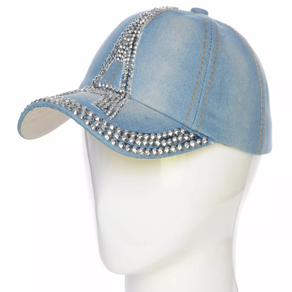 Яркая джинсовая кепка с крупными стразами на козырьке и мелкими