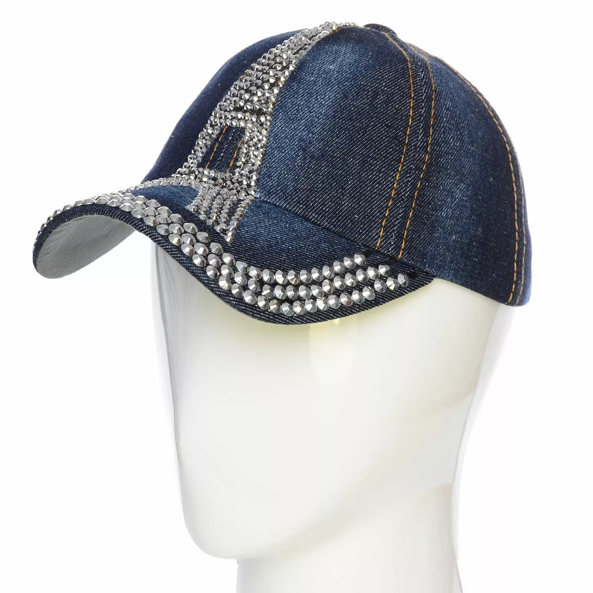 Яркая джинсовая кепка с крупными стразами на козырьке и мелкими