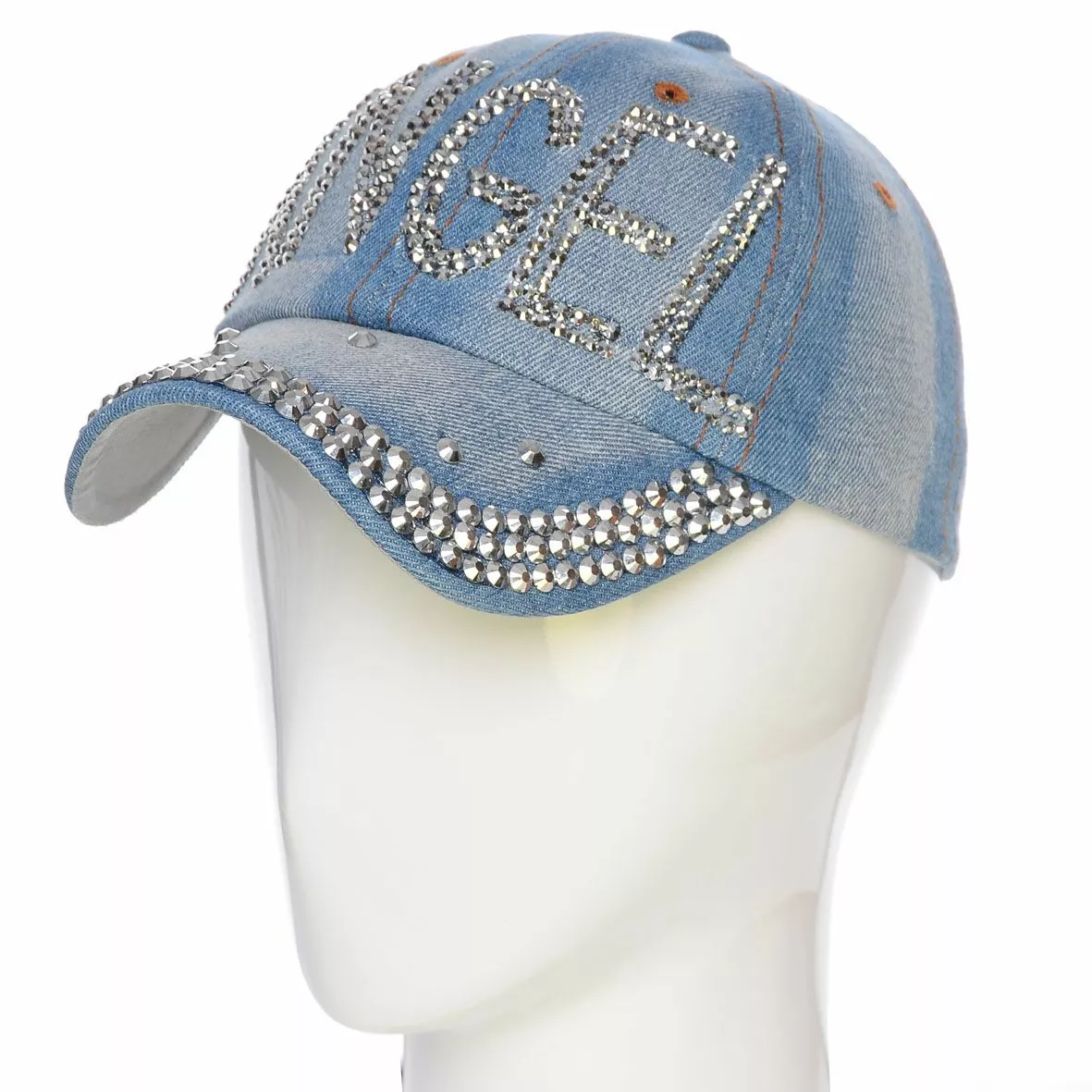 Яркая джинсовая кепка с крупными стразами на козырьке и мелкими