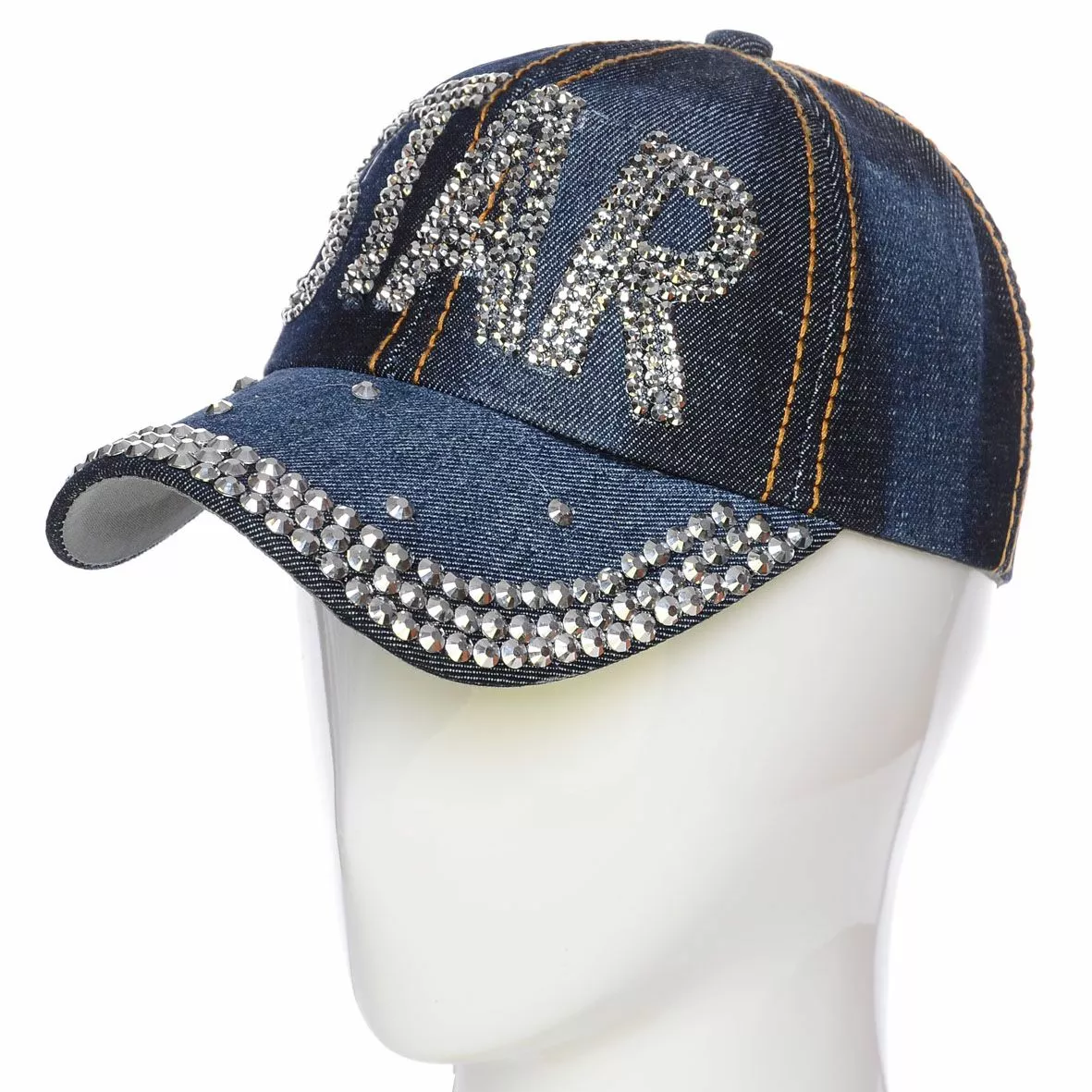 Стильная джинсовая кепка с крупными и мелкими стразами на козырьке