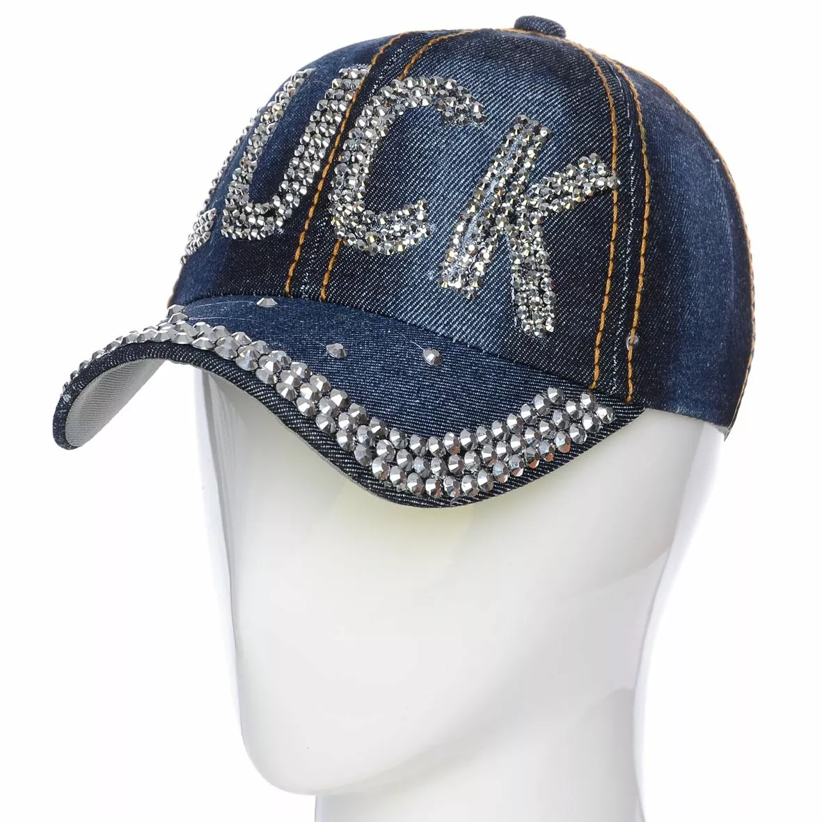 Стильная джинсовая кепка с крупными и мелкими стразами на козырьке