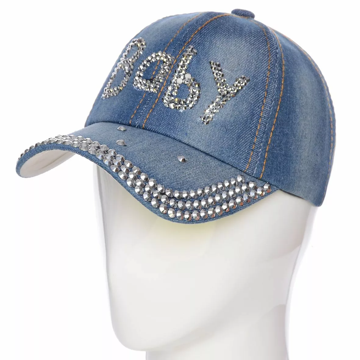 Стильная джинсовая кепка с крупными и мелкими стразами на козырьке