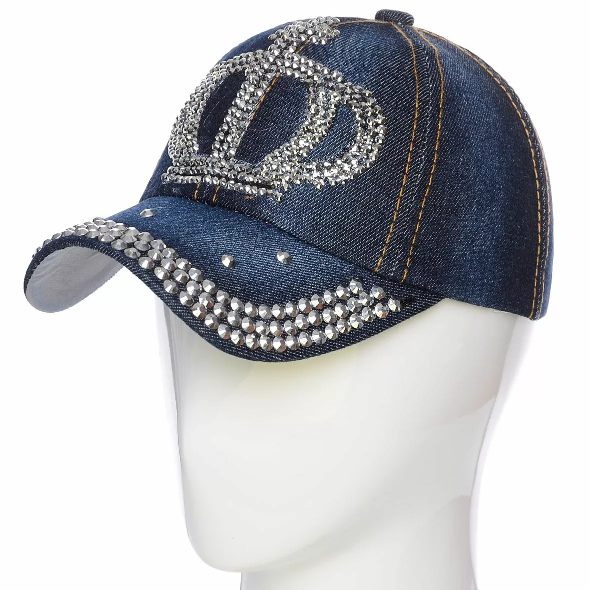 Стильная джинсовая кепка с крупными и мелкими стразами на козырьке