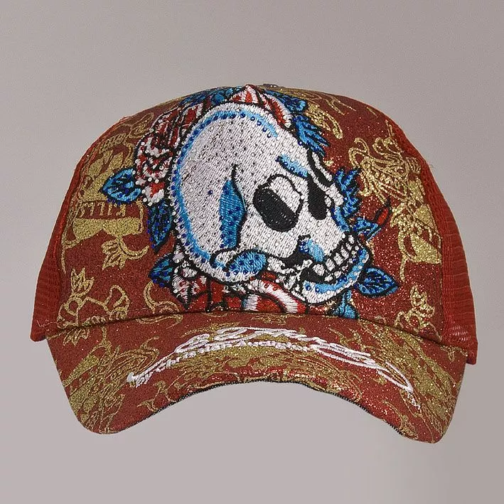 материала с вышивкой по центру изделия в виде черепа с цветами,