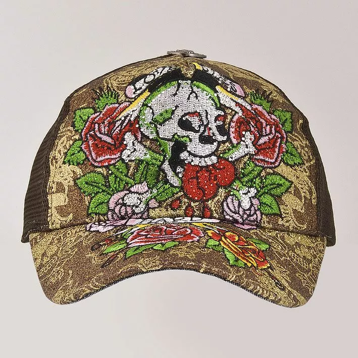 в виде черепа и роз, украшена стразами. Задняя часть головного