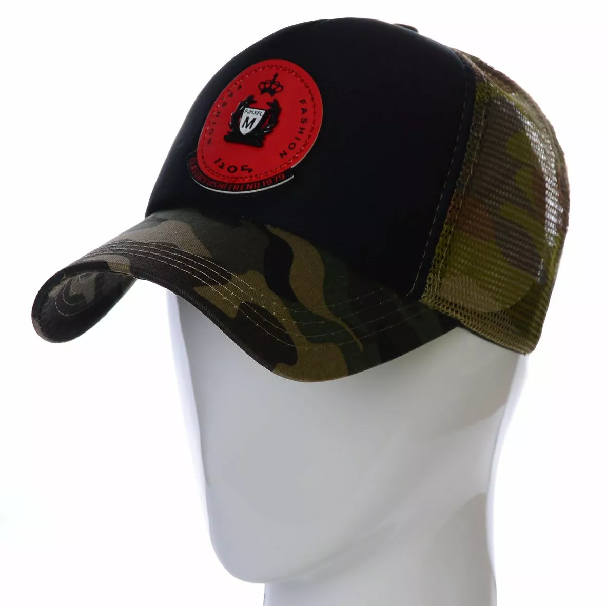 Оригинальная бейсболка тракер с яркой эмблемой красного цвета на