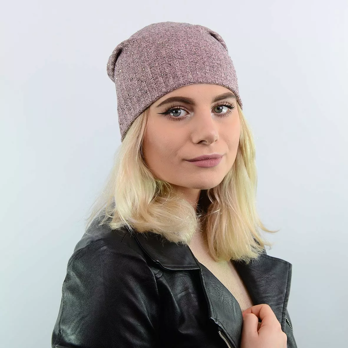 Двухслойная трикотажная шапка с люрексом, удлиненной формы,