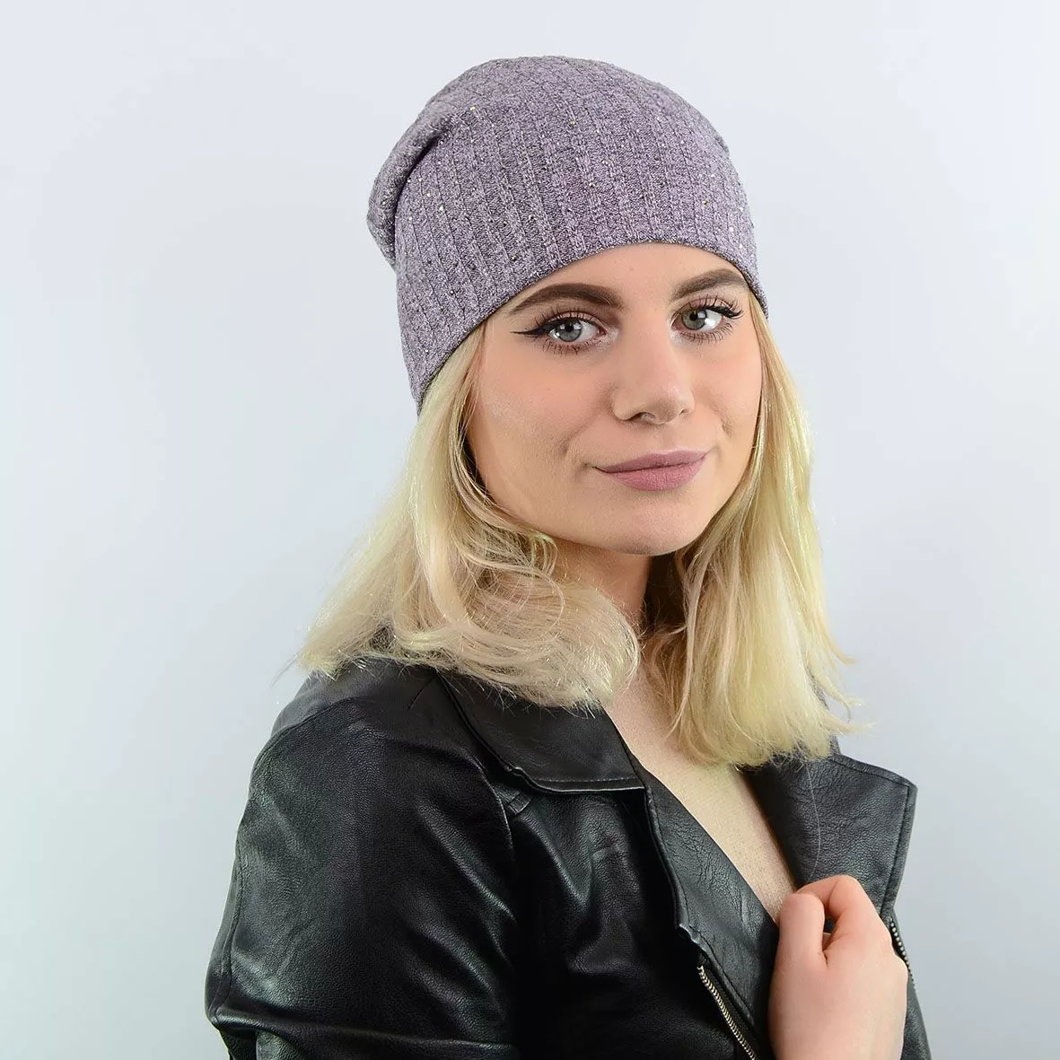 Двухслойная трикотажная шапка с люрексом, удлиненной формы,