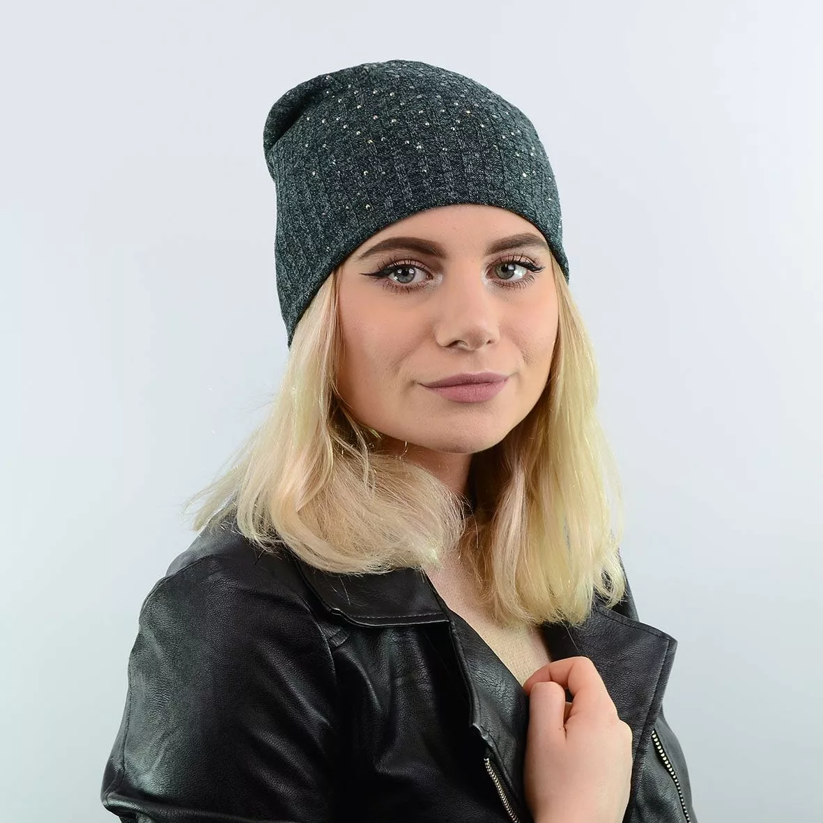 Двухслойная трикотажная шапка с люрексом, удлиненной формы,