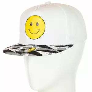 Стильная кепка с прямым козырьком в молодежном стиле. Передняя панель головного убора украшена изображением смайлика и контрастным прямым козырьком. Задняя часть имеет ремешок, который помогает регулировать размер под себя. Модная рэперская кепка подойдет любому человеку и будет оригинальным подарком на любой праздник. Изготовлена из качественного материала, смотрится очень оригинально и стильно.