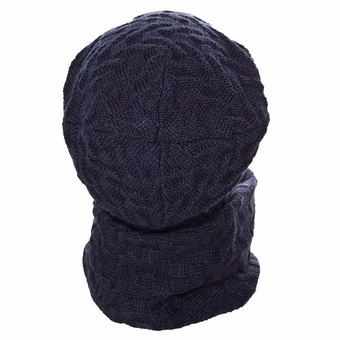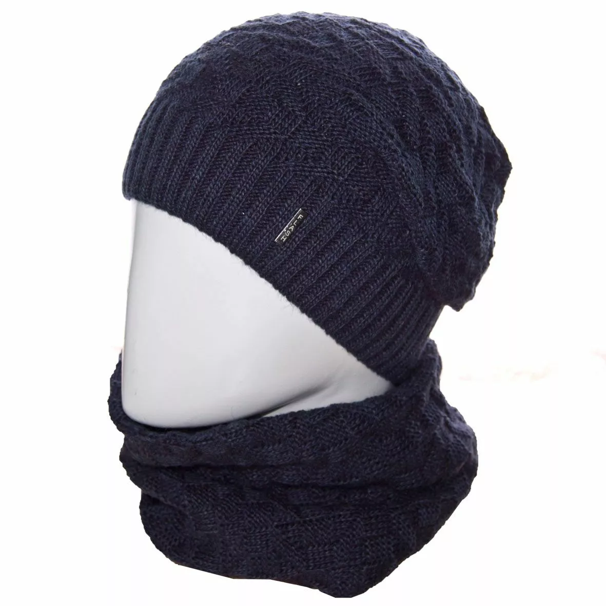 Вязаный однотонный мужской комплект состоит из удлиненной шапки, с