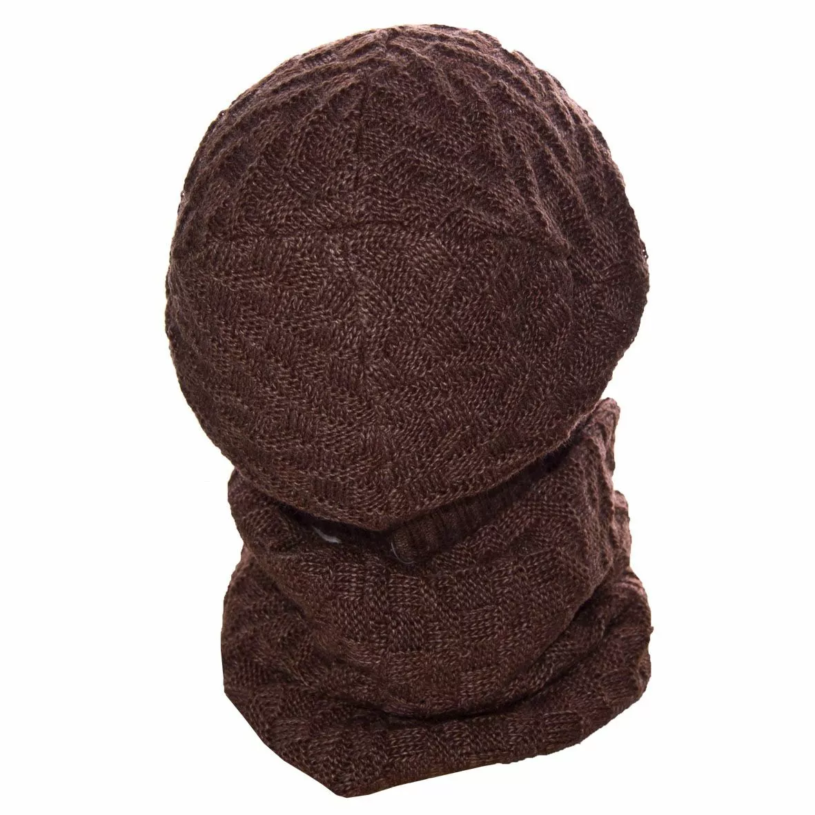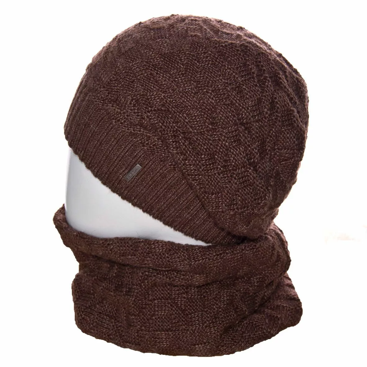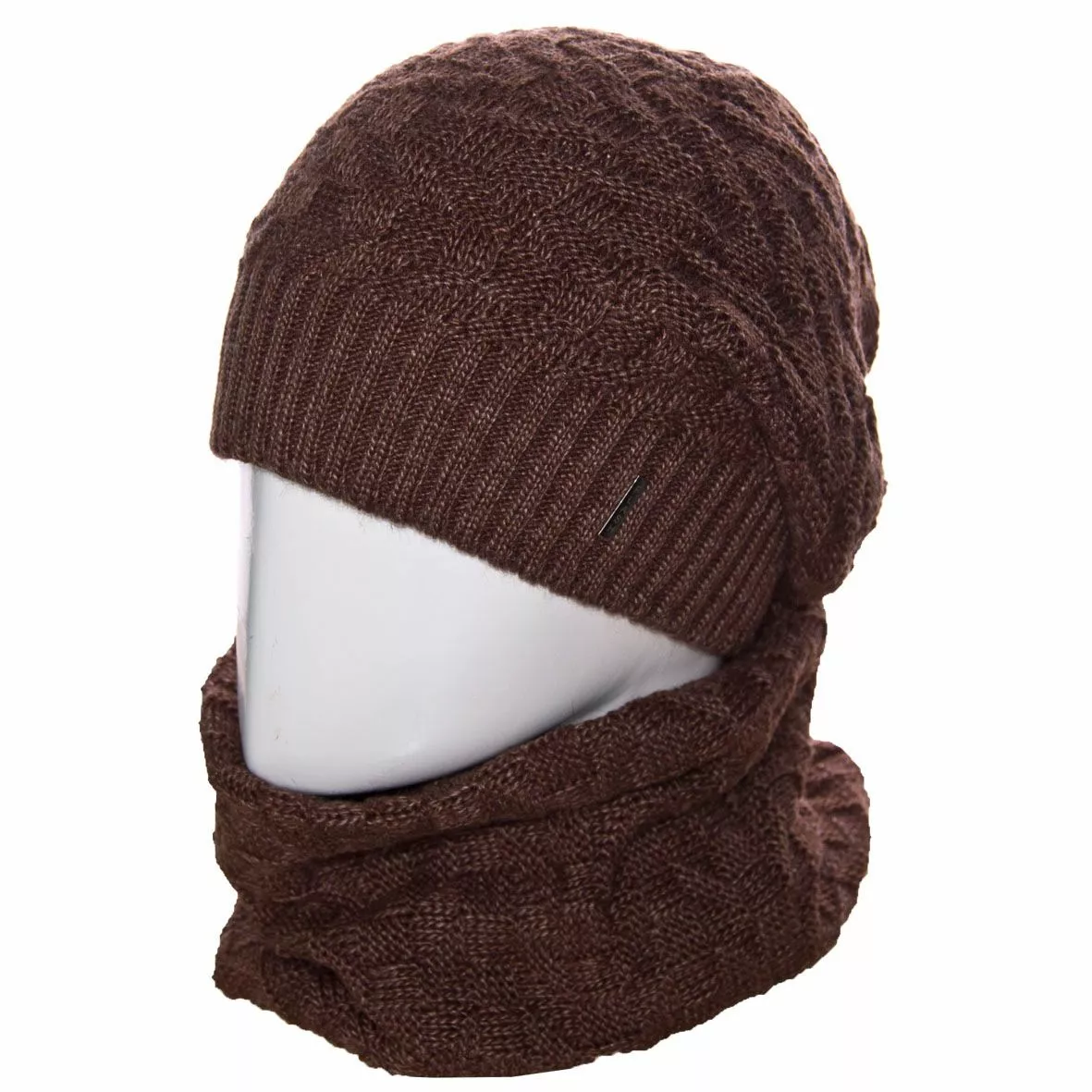 Вязаный однотонный мужской комплект состоит из удлиненной шапки, с