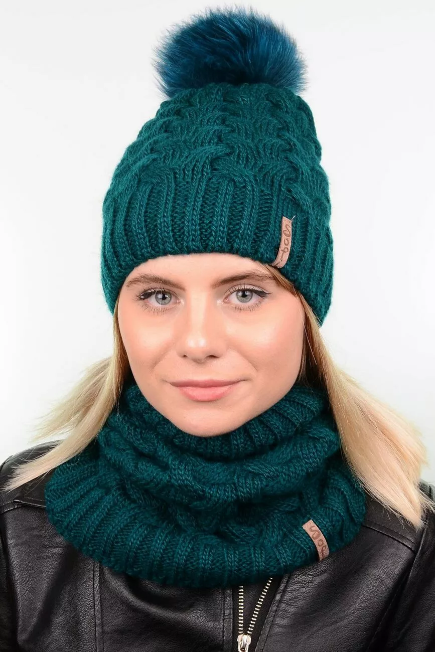 верхней одежде. В набор входят вязаная шапка с меховым
