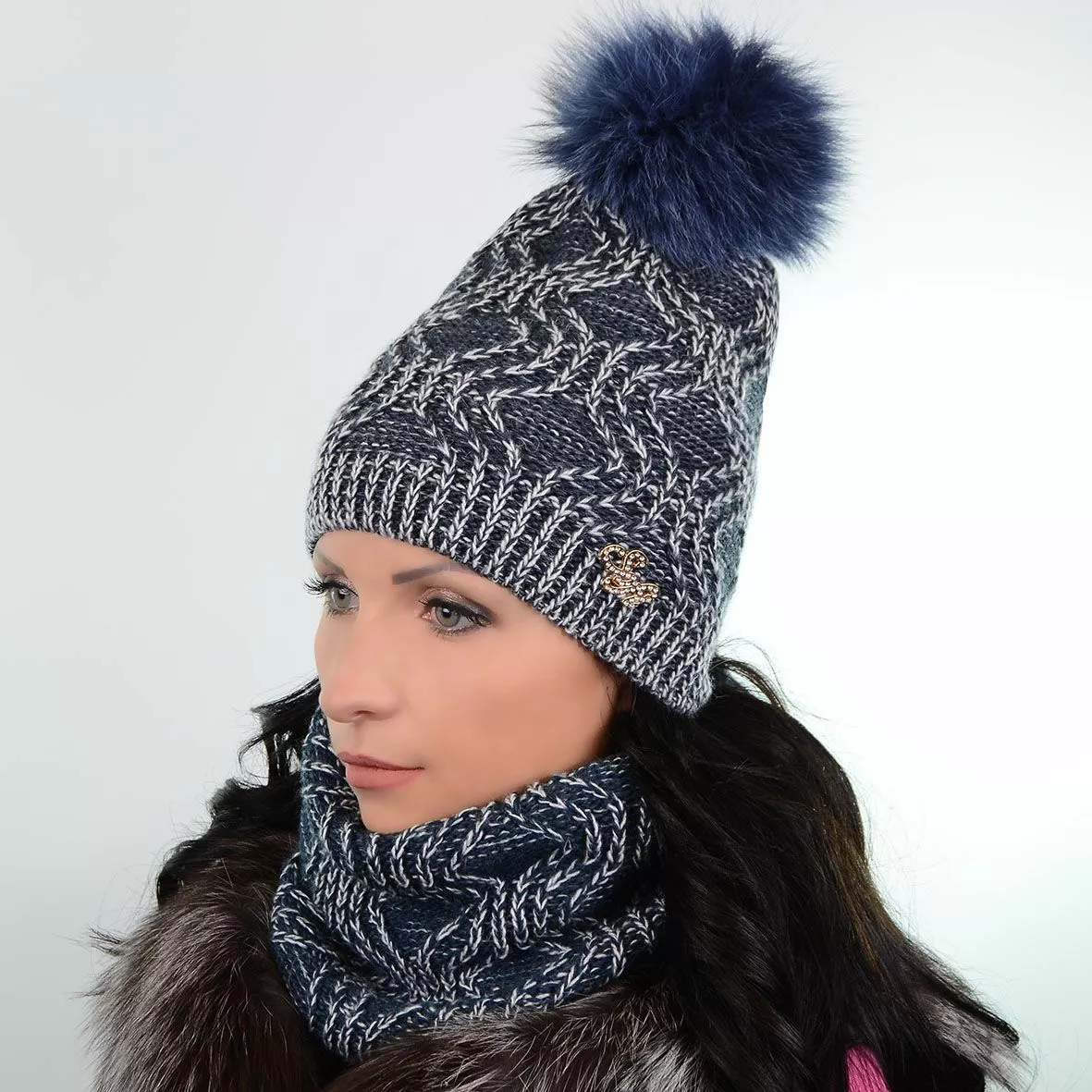 верхней одежде. В набор входят вязаная шапка с меховым