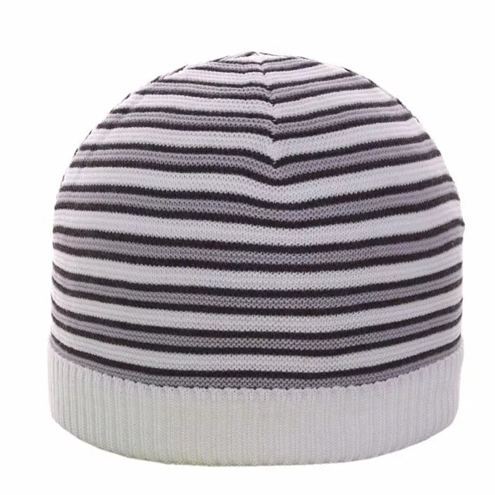 погоду. Шапка имеет расцветку в полоску, её край оформлено мелкой