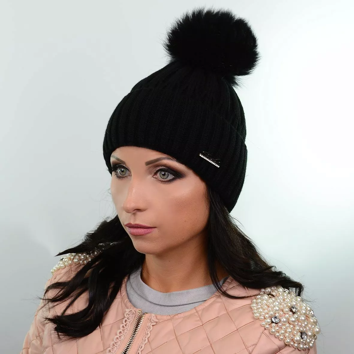 Вязаная шапка с широким отворотом и натуральным меховым помпоном –