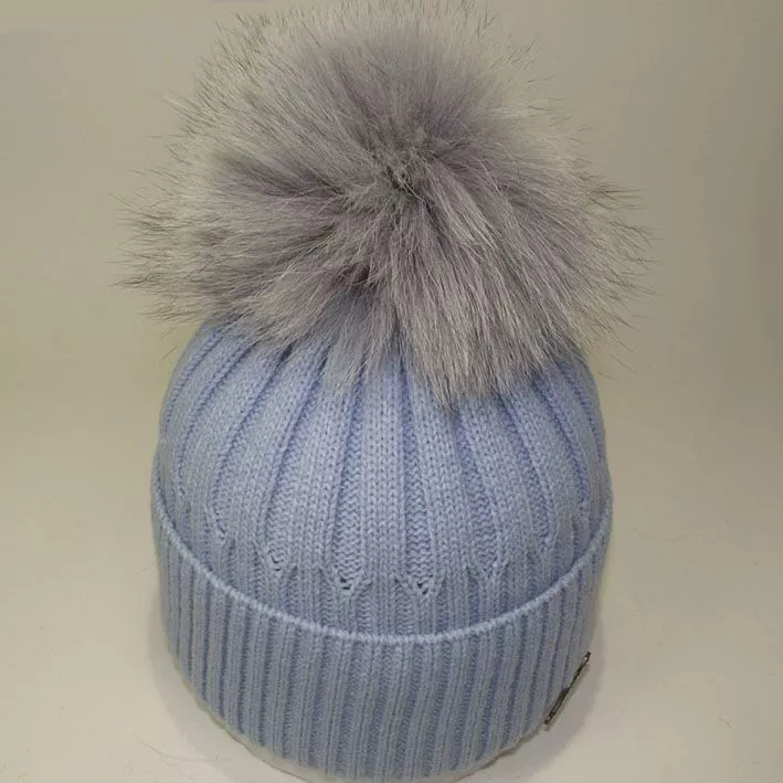 Вязаная шапка с широким отворотом и натуральным меховым помпоном –