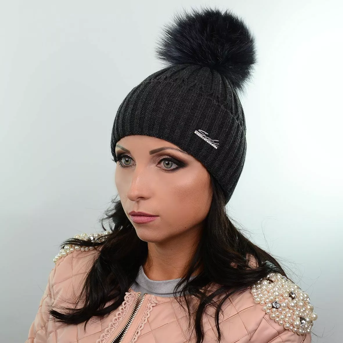Вязаная шапка с широким отворотом и натуральным меховым помпоном –