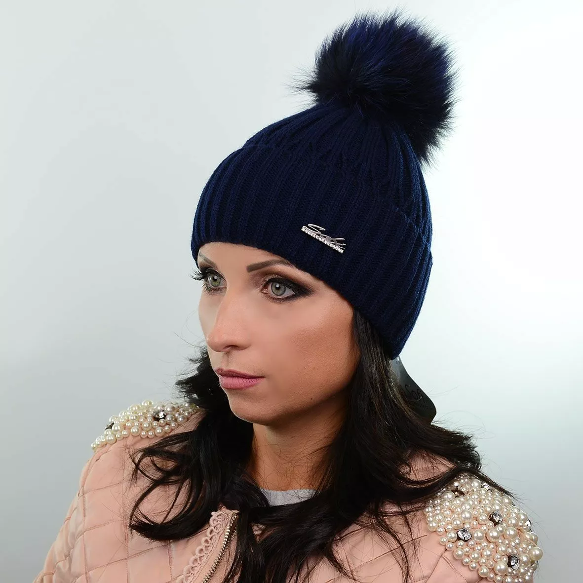 Вязаная шапка с широким отворотом и натуральным меховым помпоном –