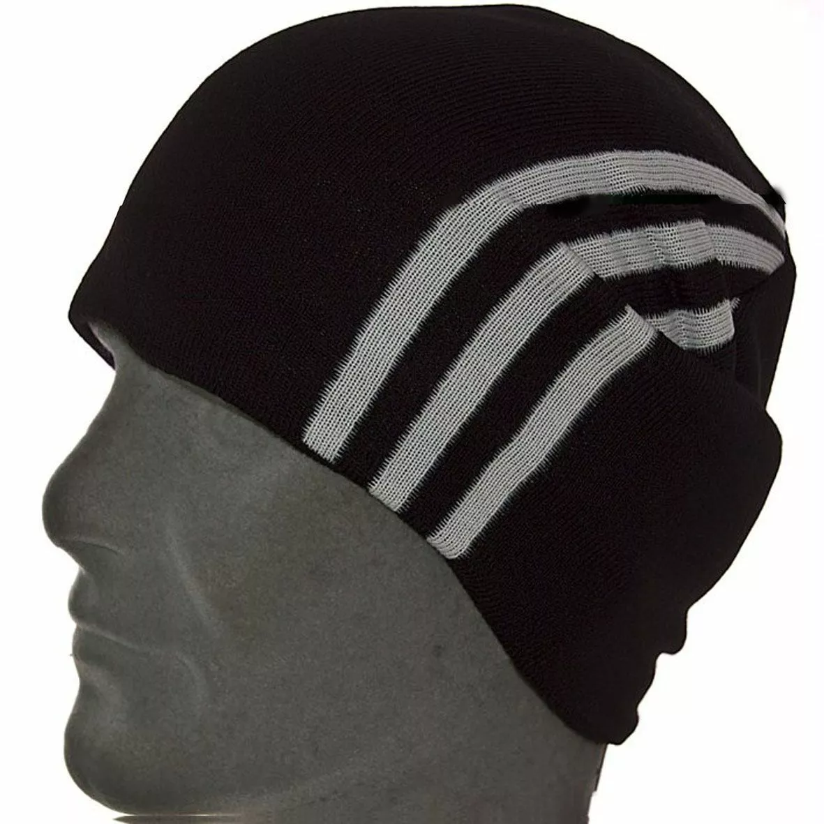 Удлиненная вязаная шапка с тремя полосами по бокам, придают этому