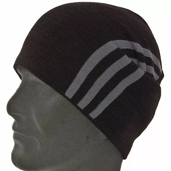 Удлиненная вязаная шапка с тремя полосами по бокам, придают этому