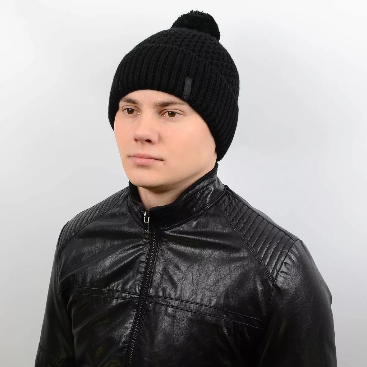 Теплая мужская шапка с подворотом и бубоном, выполнена из шерсти с