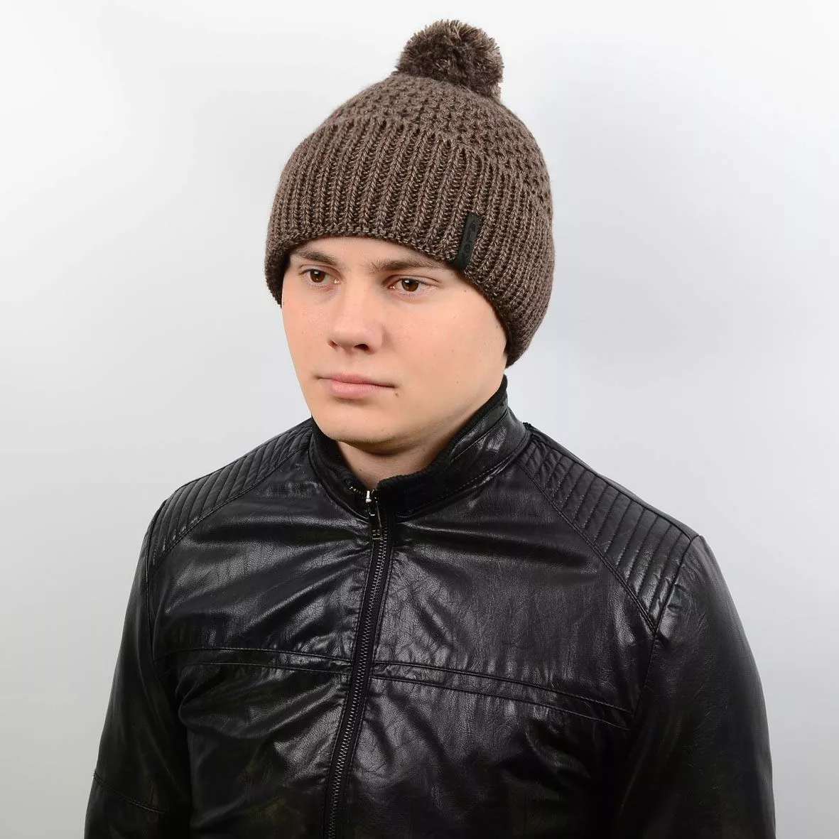 Теплая мужская шапка с подворотом и бубоном, выполнена из шерсти с
