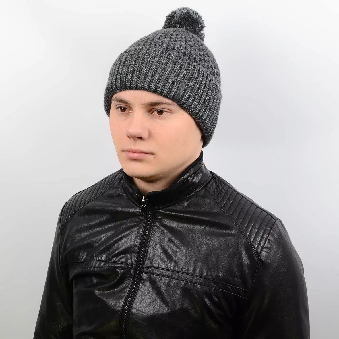Теплая мужская шапка с подворотом и бубоном, выполнена из шерсти с