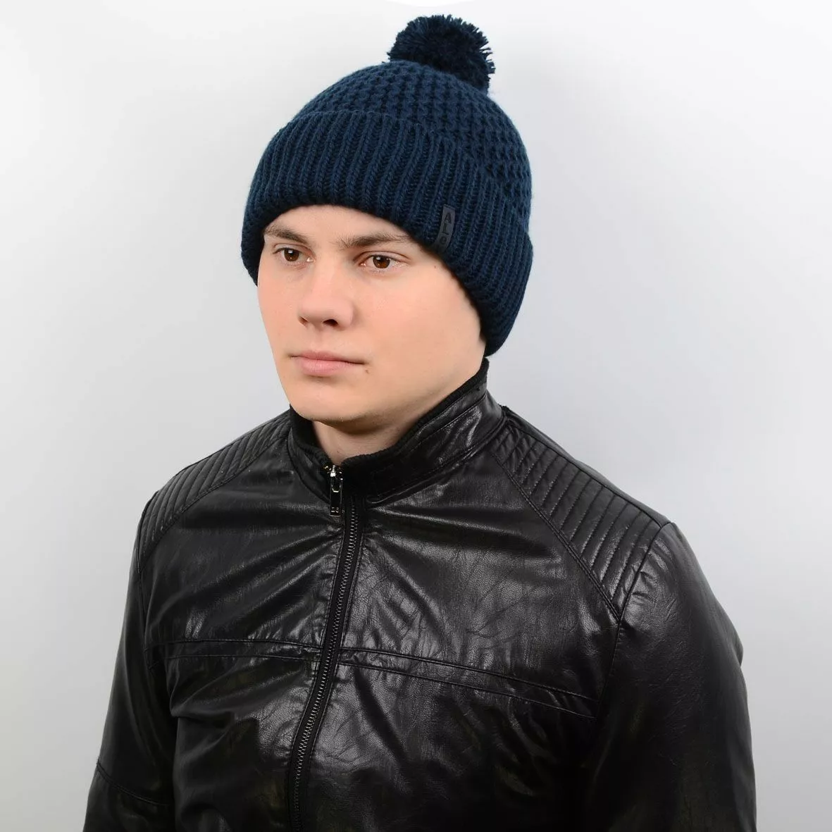 Теплая мужская шапка с подворотом и бубоном, выполнена из шерсти с