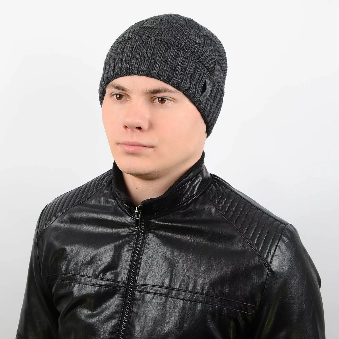 Вязаная мужская шапка выполнена красивой узорной вязкой с отворотом
