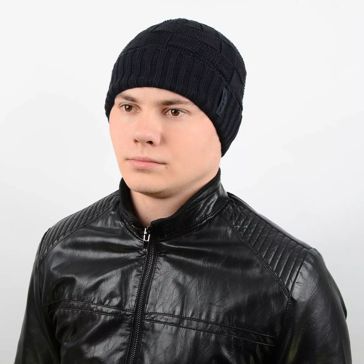Вязаная мужская шапка выполнена красивой узорной вязкой с отворотом