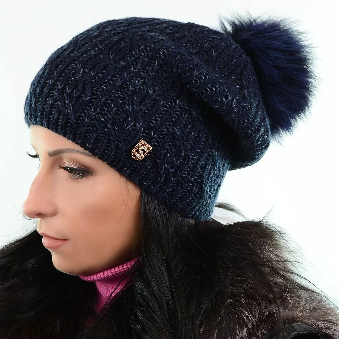 Модная зимняя шапка с натуральным меховым помпоном - смотрится