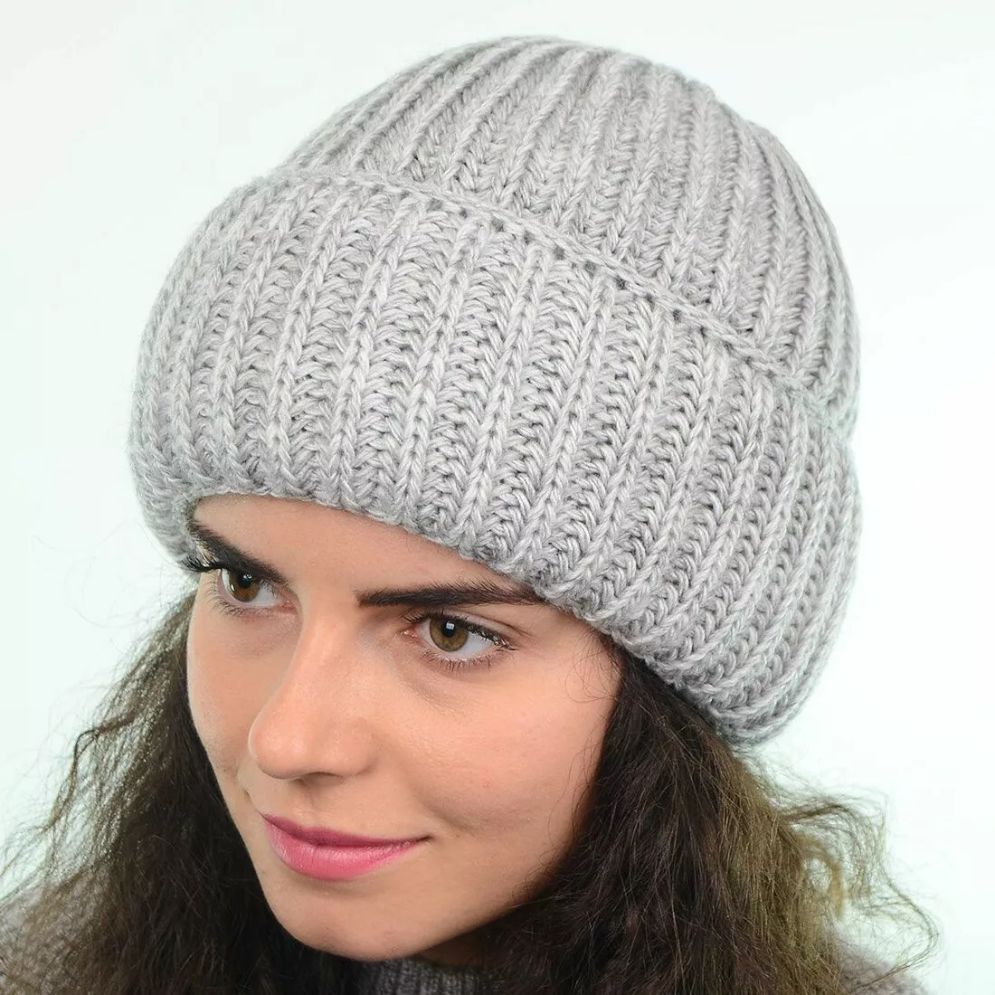 Зимняя женская шапка выполнена крупкой вязкой, имеет двойной