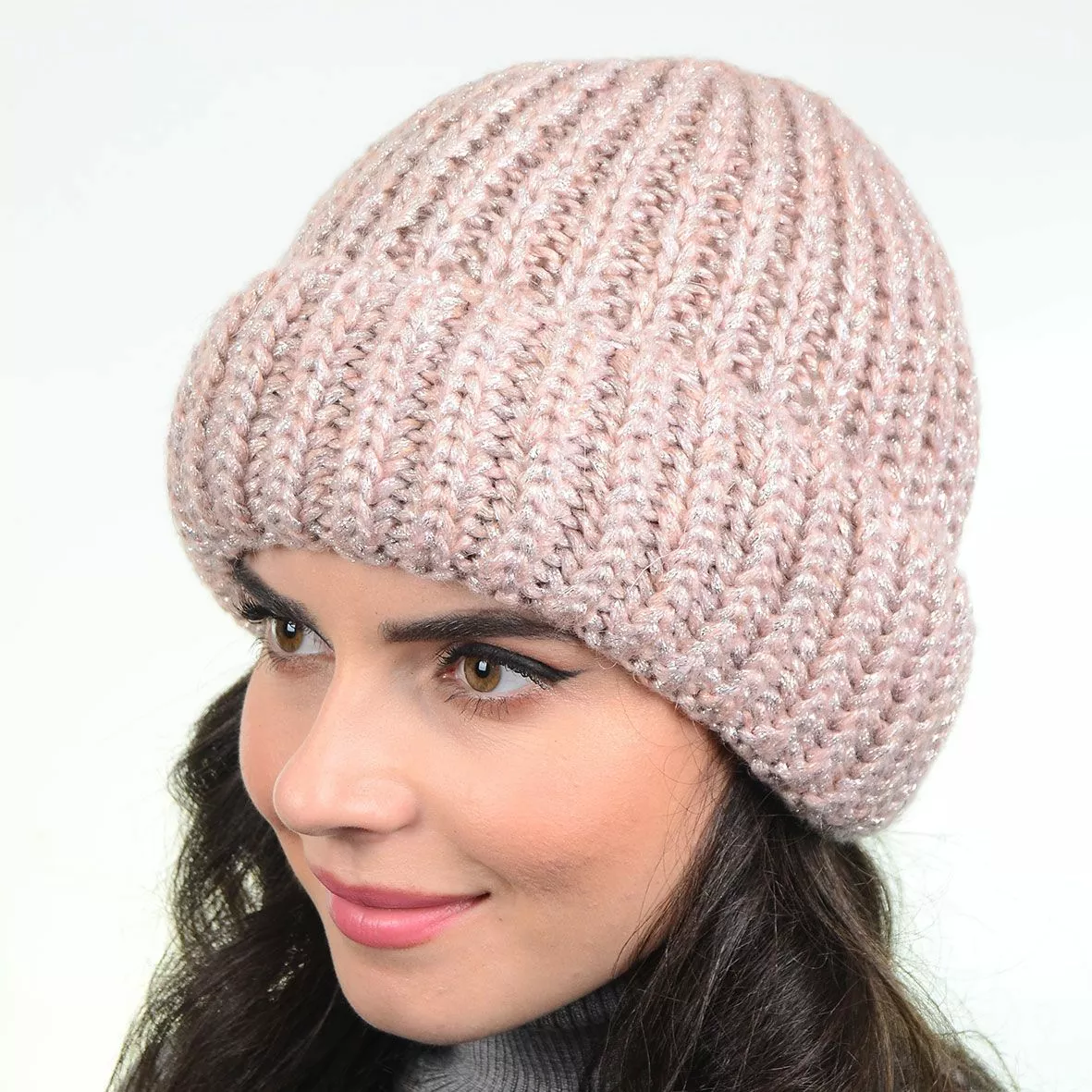 Зимняя женская шапка связана из пряжи с нитями люрекса,