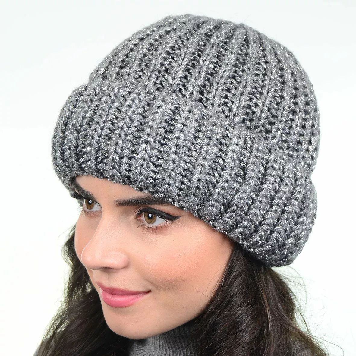 Зимняя женская шапка связана из пряжи с нитями люрекса,