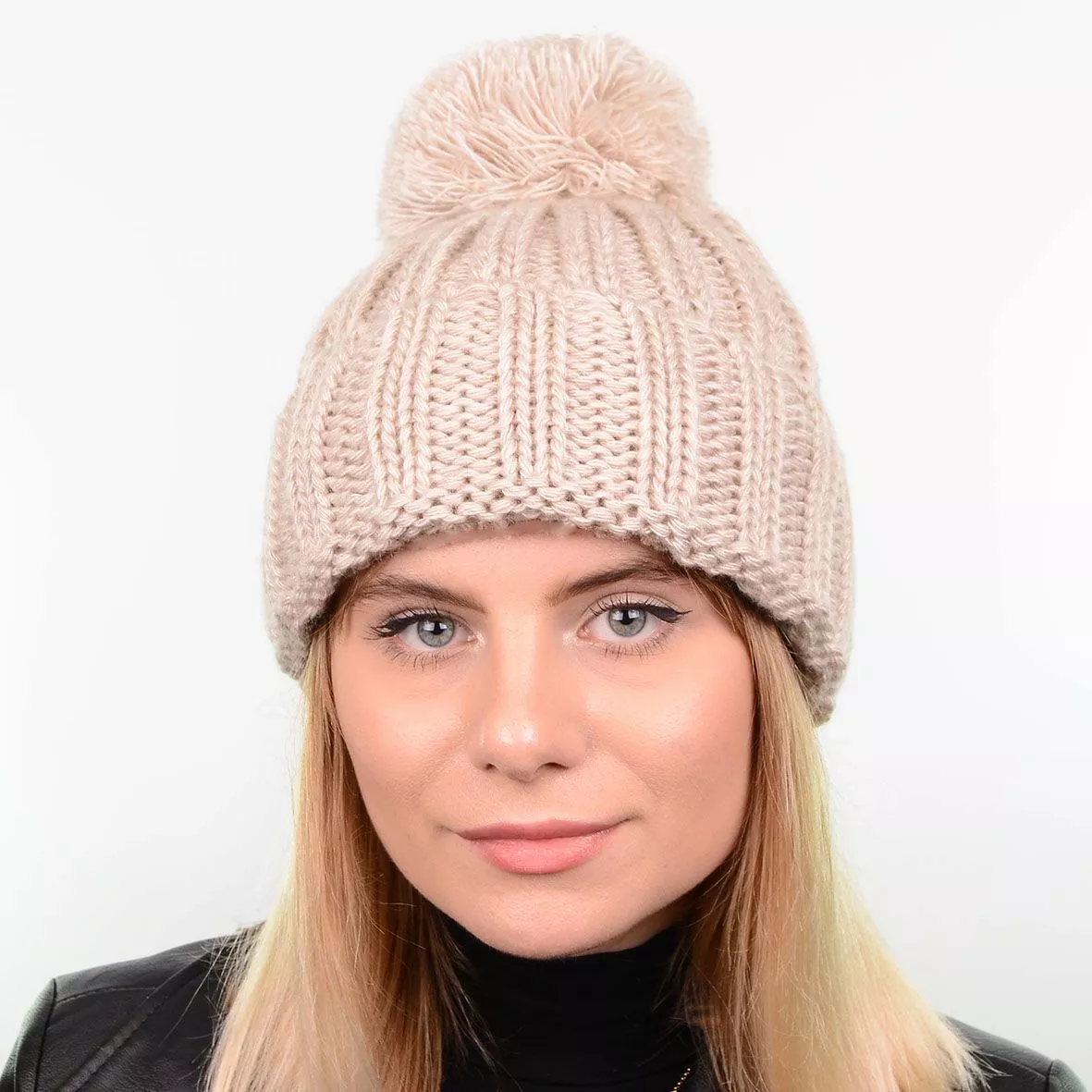 Вязаная женская шапка с пышным ниточным помпоном - придаёт