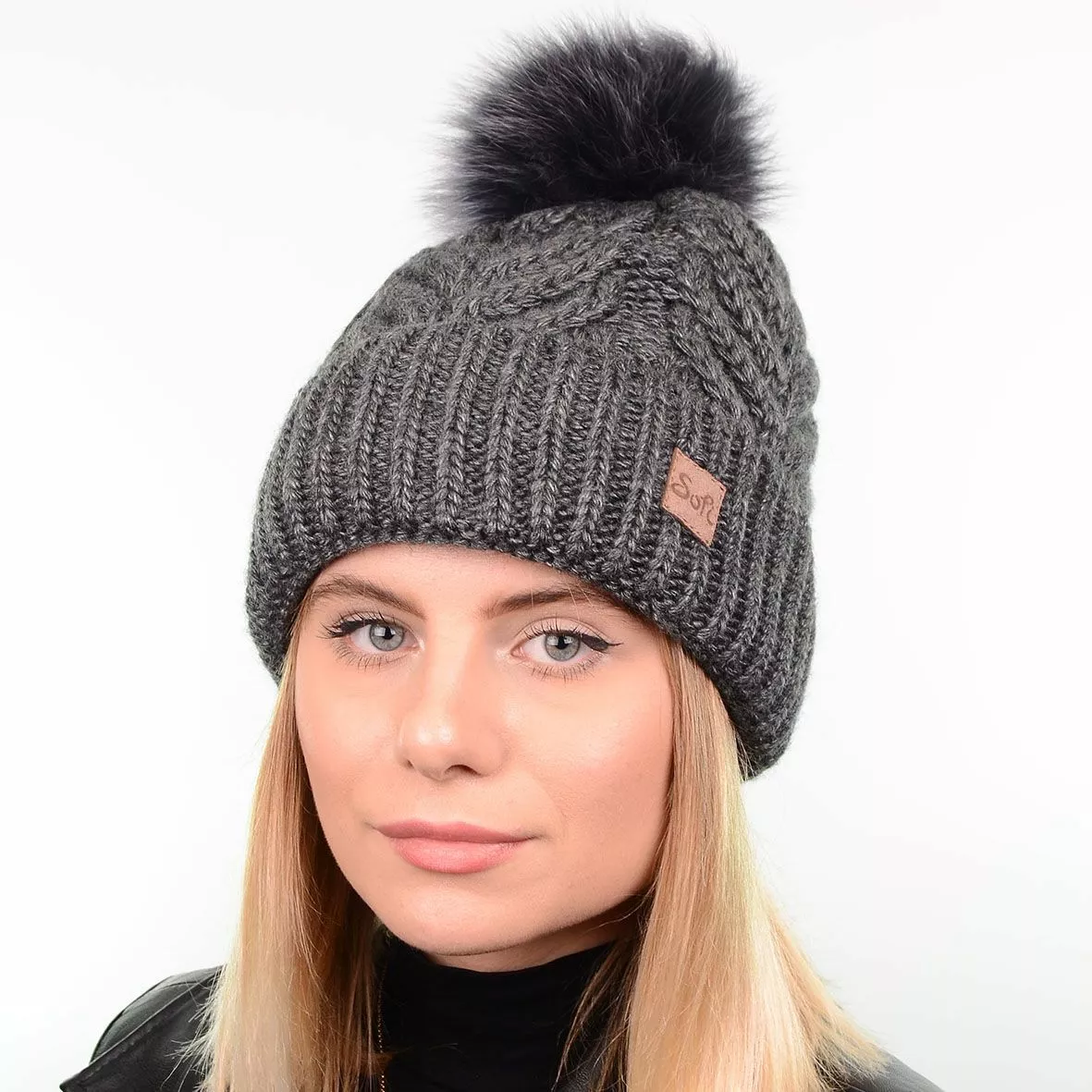 Модная зимняя шапка с натуральным меховым помпоном - смотрится