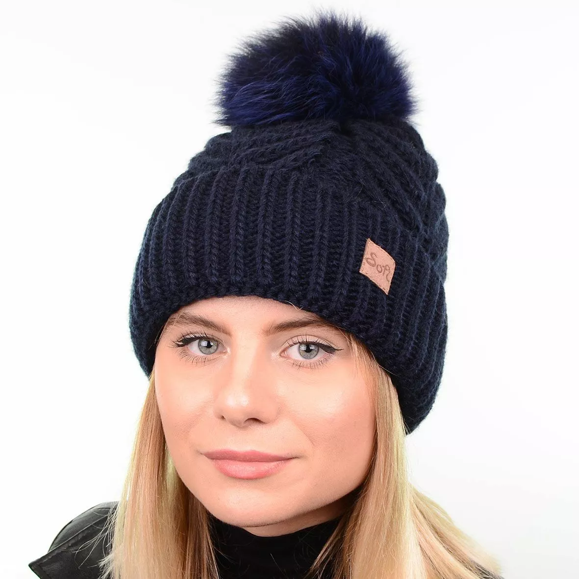 Модная зимняя шапка с натуральным меховым помпоном - смотрится