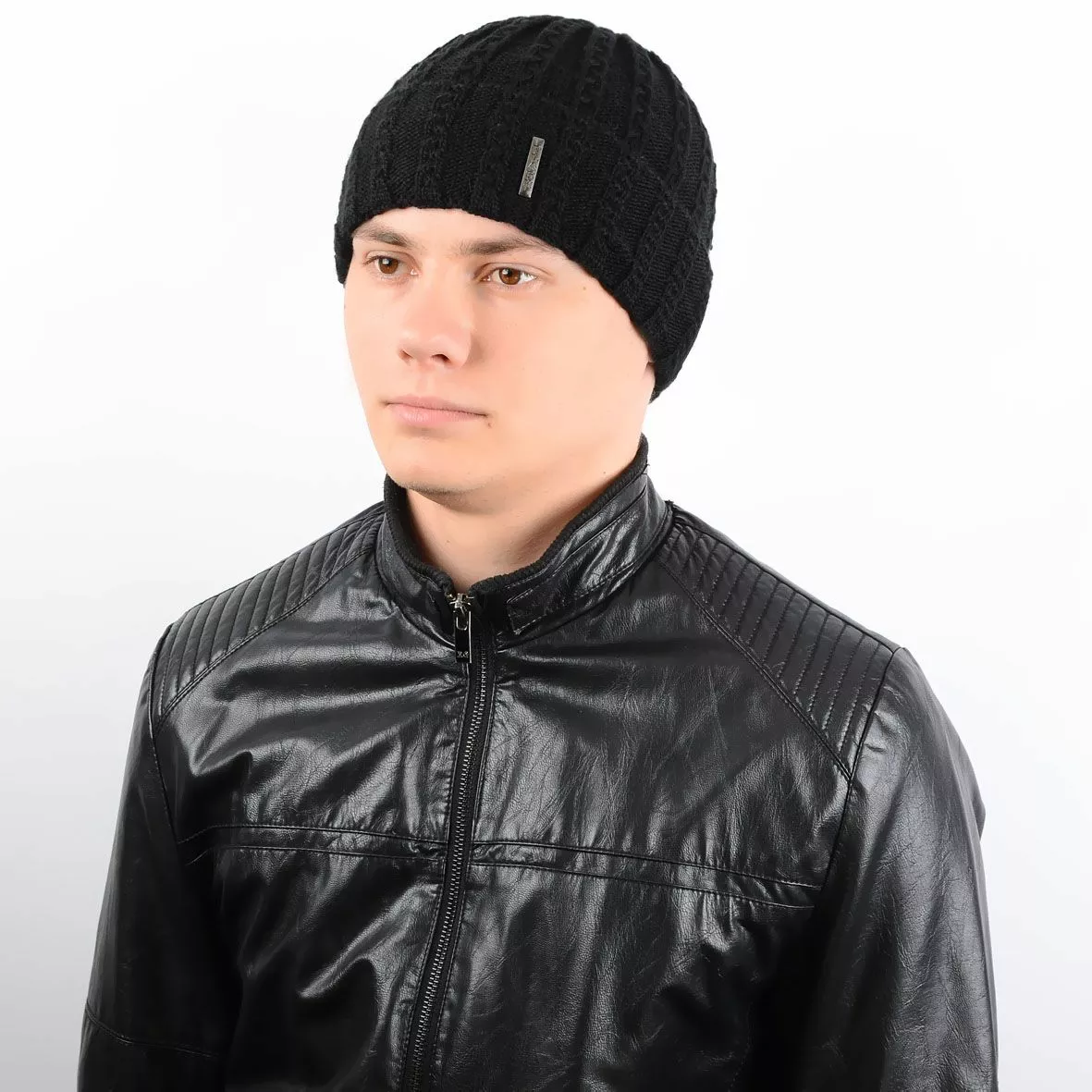 Стильная мужская вязаная шапка, выполнена оригинальной вязкой в